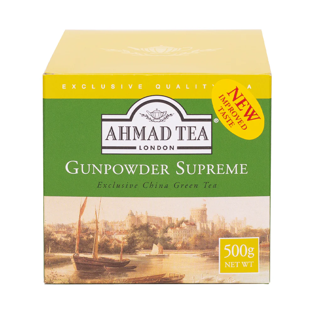 Ahmad Tea Gunpowder Supreme is a high-quality loose-leaf green tea featuring tightly rolled leaves with a robust, slightly smoky flavor. This 500g pack ensures a fresh supply of vibrant, aromatic tea that’s perfect for both traditional and modern brewing methods. Enjoy a refreshing and energizing cup anytime.