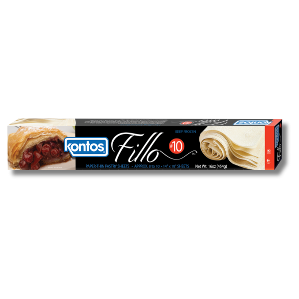 Kontos Fillo No. 4 Pastry Sheets are tissue-thin and pliable, ideal for creating delicate pastries and bite-sized hors d’oeuvres. Each 16 oz package contains approximately 18 to 22 sheets, measuring 14″ x 18″, that bake to a soft, silky texture with a light golden color. These sheets are made with enriched wheat flour, water, and cornstarch, and are both Kosher and Halal certified.