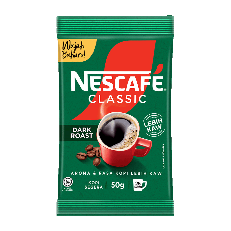 NESCAFÉ® Classic Dark Roast Instant Coffee is made from 100% pure coffee beans, offering a rich and bold flavor. This 50g pouch provides approximately 25 servings, making it a convenient choice for coffee enthusiasts seeking a strong and aromatic cup. Perfect for both hot and iced preparations, it delivers a satisfying coffee experience.