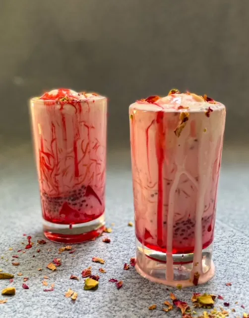 Real Falooda Drink Rose is a delightful and aromatic beverage infused with the essence of rose, basil seeds, and vermicelli. A refreshing and sweet treat for any time of the day.