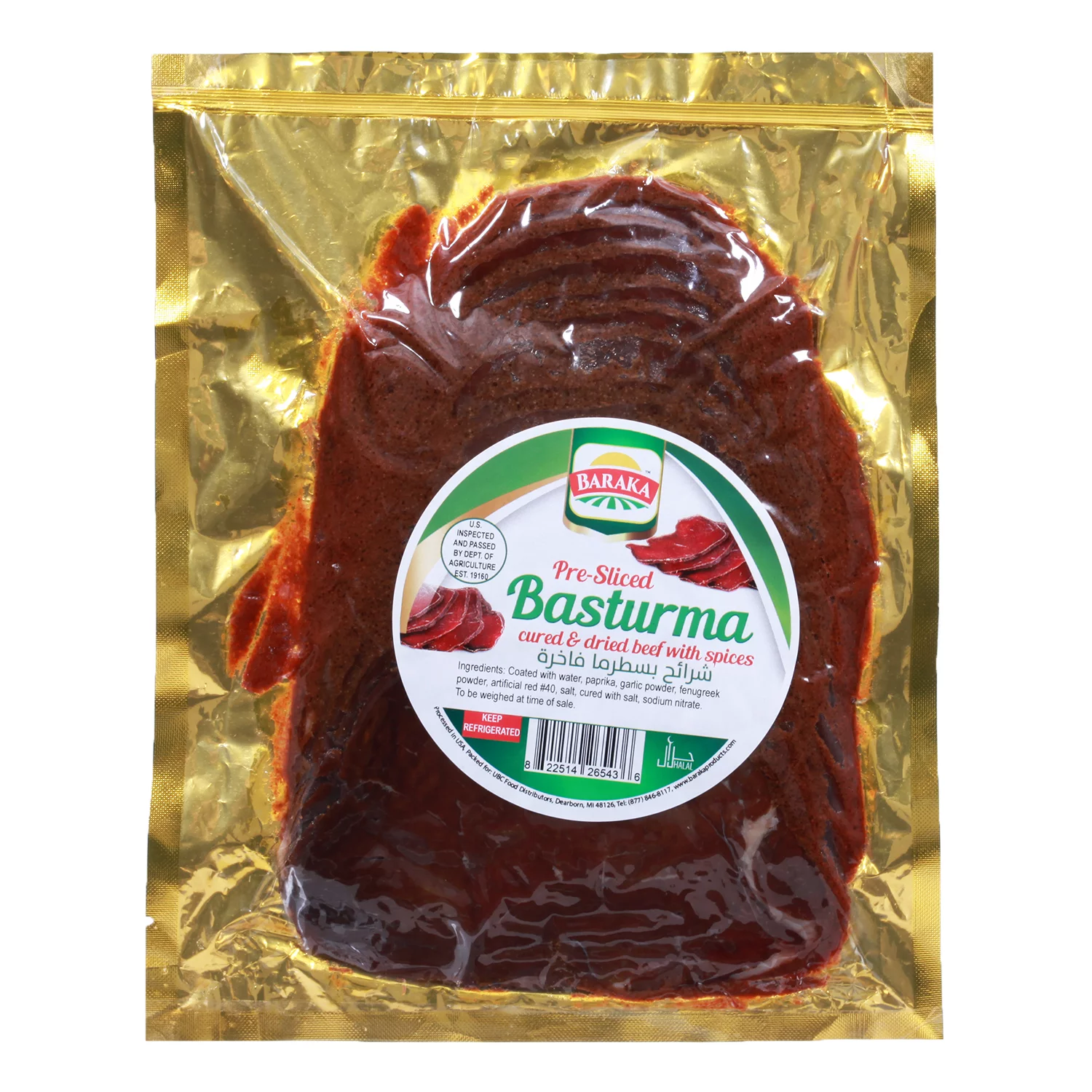 Sultan Sliced Basturma is a premium air-dried cured beef, seasoned with a rich blend of spices including fenugreek, garlic, and paprika. This ready-to-eat delicacy is perfect for sandwiches, appetizers, or charcuterie boards. Packed with bold, savory flavor.